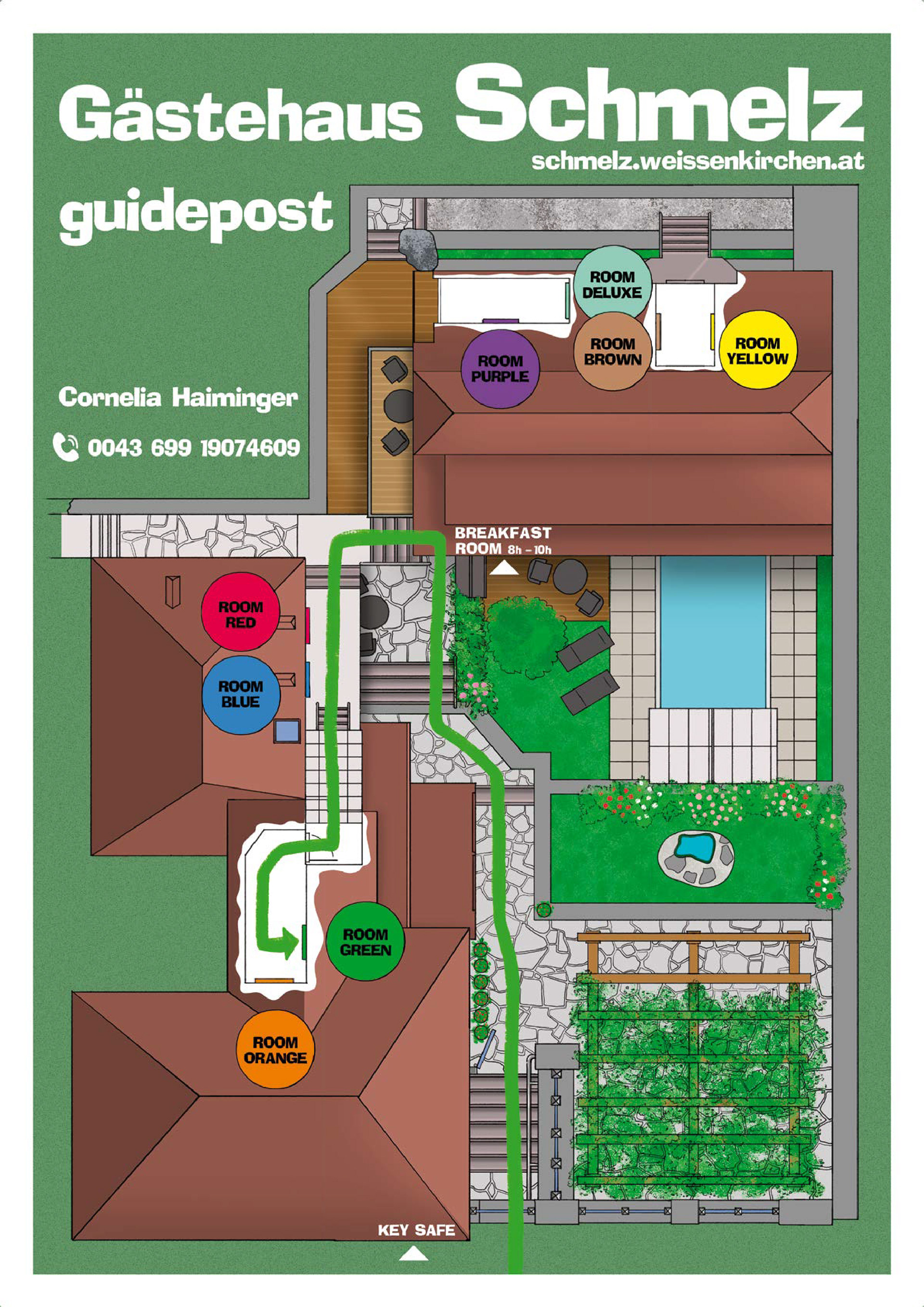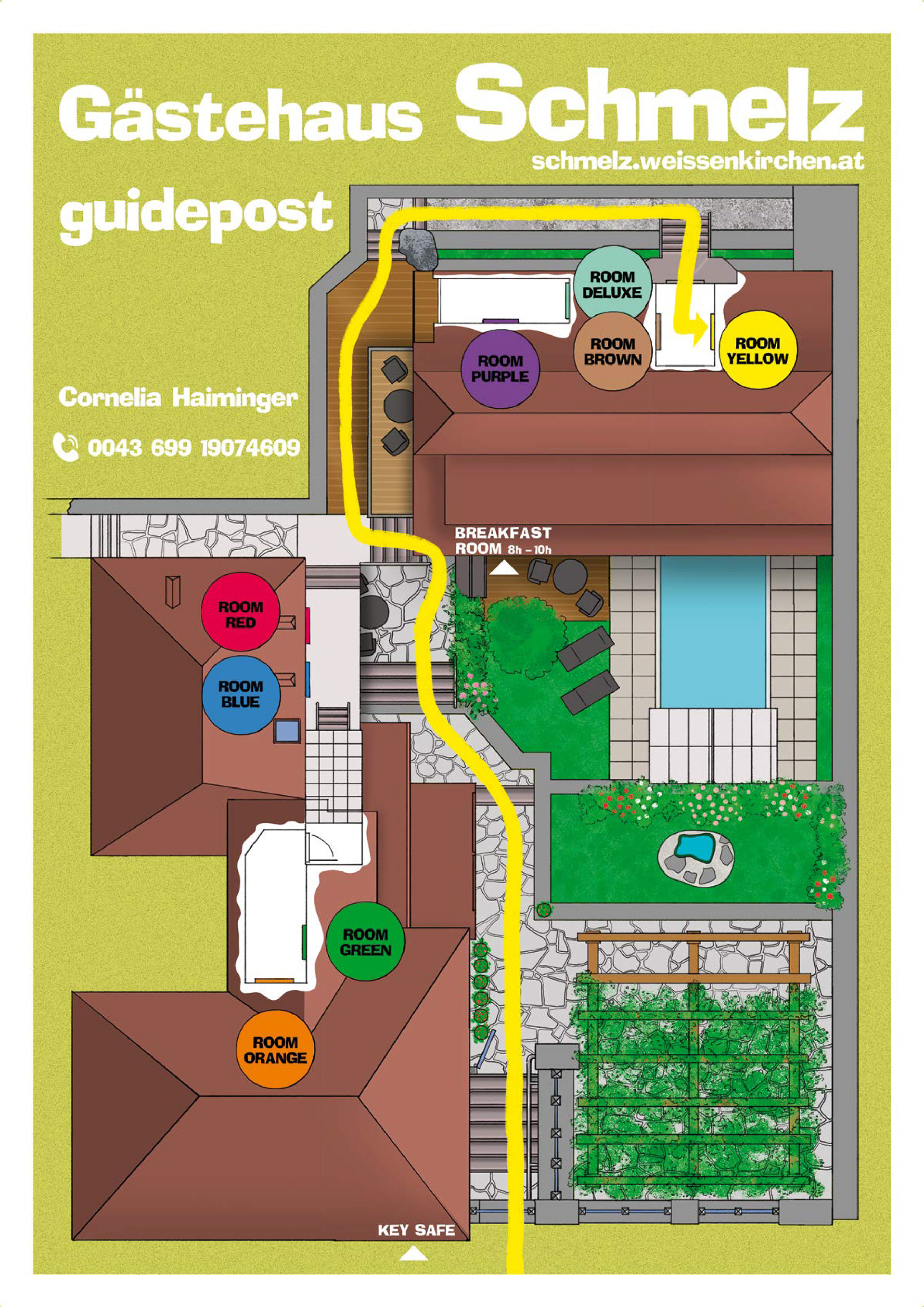Das Hotel wird ohne Rezeption geführt. Die Gäste kommen mittels Schlüsseltresor zu ihrem Zimmerschlüssel. Damit die Hotelgäste einfach und schnell zu ihrem Zimmer finden wurde nach einem Farbkodex ein Wegweiser/guidepost entwickelt und illustriert.